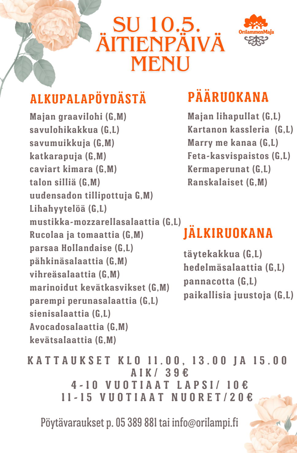 Äitienpäivän kattaukset sunnuntaina 10.5.2026 klo 11, 13 ja 15, varatkaa paikkanne ajoissa.